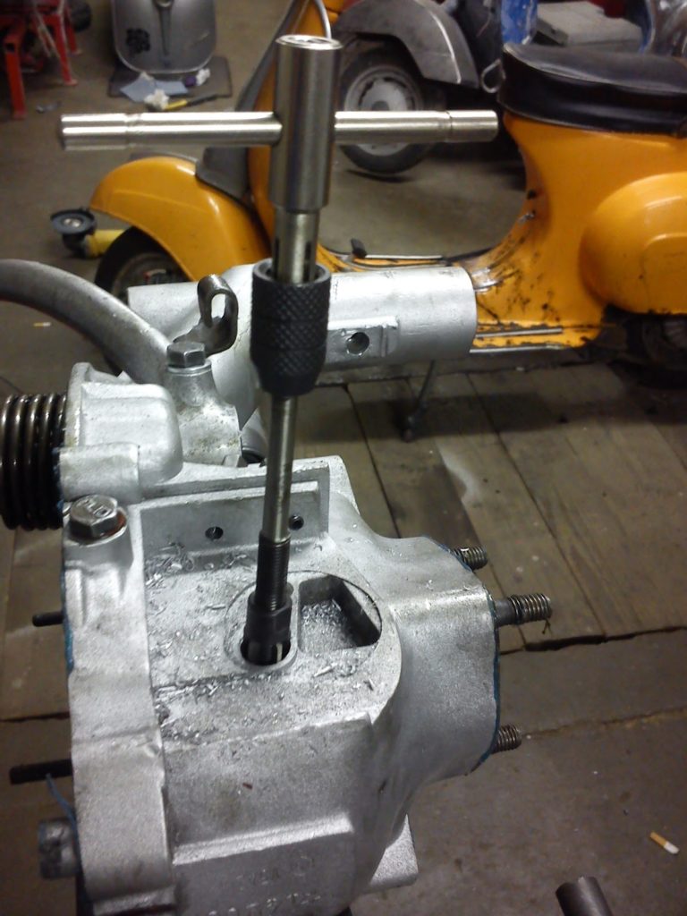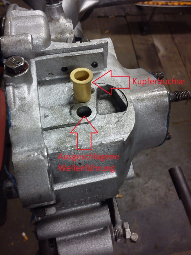 Ein klassisches Übel ist die Undichtigkeit der Vespa V50 Motoren. Normalerweise liegt es an alten Dichtungen oder alten Simmerringen. Standardprozedere ist es also den Motor zu spalten und neu abzudichten. Aber manchmal reicht das leider nicht und zwar wenn das Öl aus der Führung des Schaltarmes rausläuft, weil diese ausgeschlagen bzw. eingelaufen ist. Ich hatte es bei diesem Motor auch erst mit Übermaß-O-Ringen zur Abdichtung des Schaltarmes versucht, aber die Führung im Gehäuse war zu stark ausgeschlagen und schon leicht oval – hat also nix gebracht. Also Motor wieder raus aus der Vespa, öffnen und eine Kupferbuchse einsetzen.
