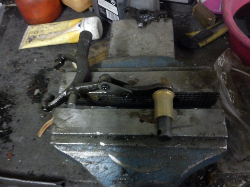 Als erstes wird mal getestet, wie gut der Schaltarm in die neue Kupferführungshülse passt. Laut Hersteller ist hier oft oder sogar normalerweise Nacharbeit erforderlich, da die Maße der Schaltarme ab Werk einigermaßen variieren. D.h. gegebenenfalls muss man noch die Hülse innen aufweiten mit entweder einer Reibahle oder gipsy-mäßig mit z.Bsp. einem mit Schleifpapier umwickelten Bleistift.
