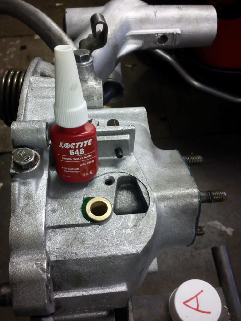 Nachdem ja das Loch für die Buchse etwas größer geworden ist als gewünscht, muss es jetzt also der Lager- und Buchsenkleber von Loctite 648 richten. Beim Buchsenkleber gibt es verschiedene Varianten was die Größe des möglichen Klebespaltes betriftt. Hier hatte ich nicht auf einen speziell hohen Wert geachtet, da ich die Buchse ja press einsetzen wollte. Der Buchsenkleber hat einen max. Klebespalt von 0,15mm, was ein tendenziell eher niedriger Wert ist. Vom Gefühl her wie die Buchse im Loch gewackelt hat dachte ich, dass das irgendwie mehr Spalt sein wird wie 0,15mm. Ich habe es aber mehrfach mit der Schieblehre nachgemessen und kam auf einen Durchmesser des aufgeriebenen Loches von 13,1mm. Das heisst also ein Klebespalt von 0,05mm und somit in der Spezifikation meines Klebers.